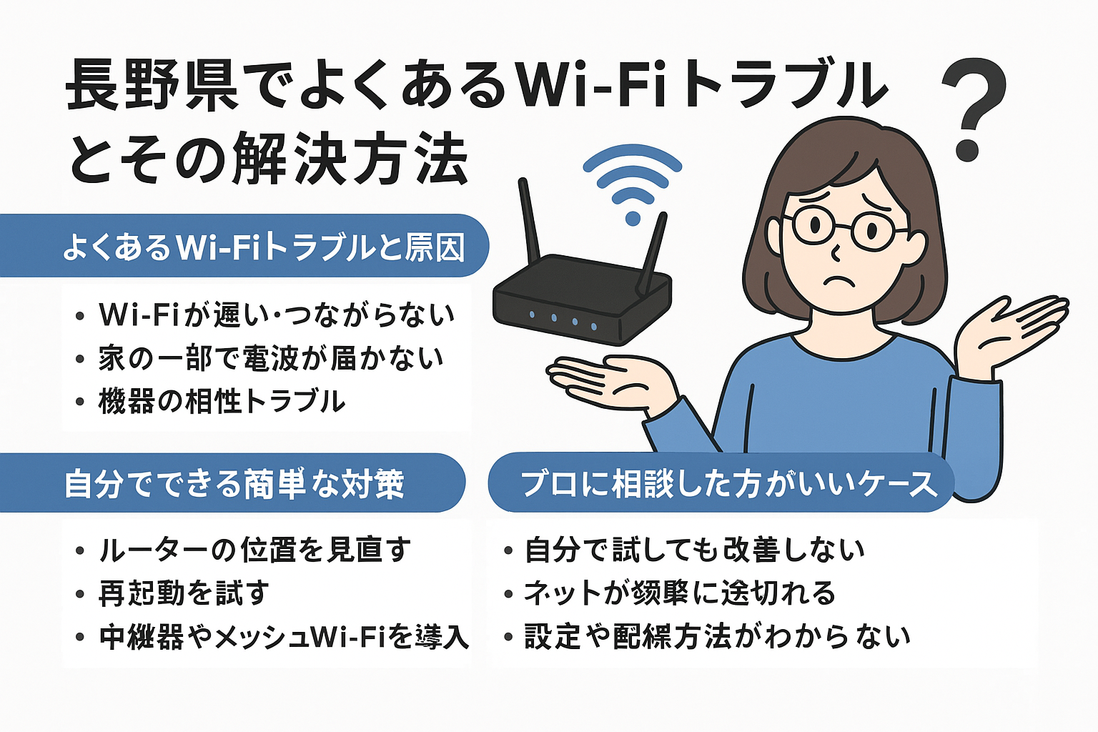 家庭でのWi-Fiトラブルは生活の不便につながります。特に長野県では、戸建て住宅や古い建物も多く、「電波が安定しない」というご相談を多くいただきます。